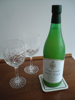 A special bottle of Apple Juice. I bought this little luxury in Sandringham a few weeks ago. Apple Juice pressed from apples from the Queen's Orchards. It was such a warm and balmy day today that we decided to treat ourselves and have it with lunch. Ice cold - it was delicious!!