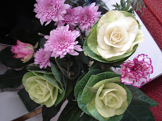 These beautiful flowers are part of a bouquet I received at the weekend - on closer inspection they appear to be like little decorative cabbages on long stalks. They have no perfume but the gorgeous shades of green go well with the pink carnations and chrysanthemums. Really lovely.